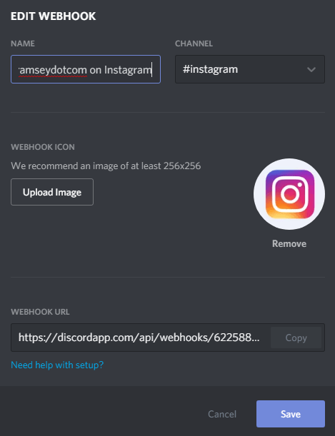 In the “EDIT WEBHOOK” dialog box, put whatever you would like under “NAME”, in the “CHANNEL” selection be sure it’s the channel you want the tweet to show up in. “WEBHOOK ICON” is an image that will show up in the post, I just used the Instagram logo. Then copy the “WEBHOOK URL” to notepad. We will use this later.