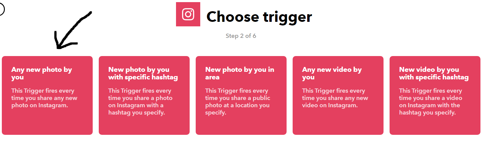 Now we want to choose a trigger. Click on “Any new photo by you” this tells IFTTT when to activate the Instagram post.